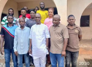 Prince Jordan Alaba Akpata (middle), President of Magongo Development Association,MDA, flanked by part-time teachers and the representative of Dr.Joachim Daudu,Mr David Salihu Ojule,left in group photograph at the occasion on Tuesday.