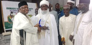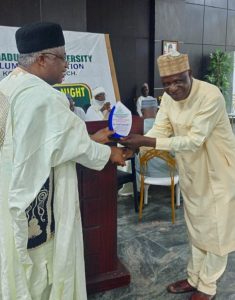 L-R:The president, world wide,ABU Alumni Association ,Mal.Adamu Kotangora, (Barden Kotangora) presenting award to the Ohimege-Igu of Kotonkatfe,Dr. Saidu Akawu.