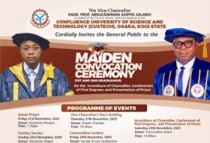 The Confluence University of Science and Technology (CUSTECH), Osara, Kogi State,on Thursday held a historic press briefing to mark its maiden convocation, with the Vice-Chancellor, Engr. Prof. Abdulrahman Asipita Salawu, announcing unprecedented institutional growth while raising an alarm over serious land encroachment threatening the university’s future.